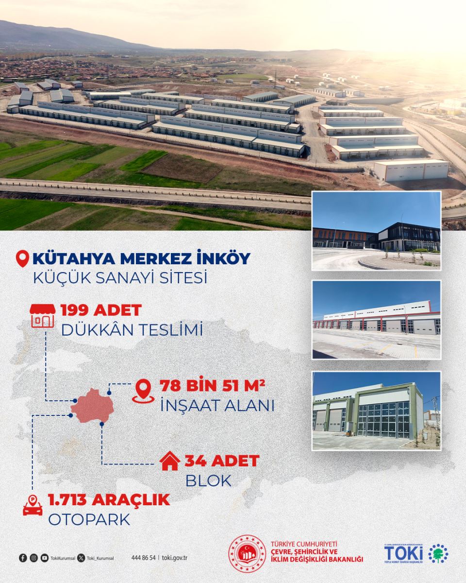 Çevre, Şehircilik ve İklim Değişikliği Bakanlığı, Toplu Konut İdaresi Başkanlığı (TOKİ) tarafından Kütahya Merkez İnköy Küçük Sanayi Sitesi'nde yapımına başlanan 199 iş yeri tamamlandı.