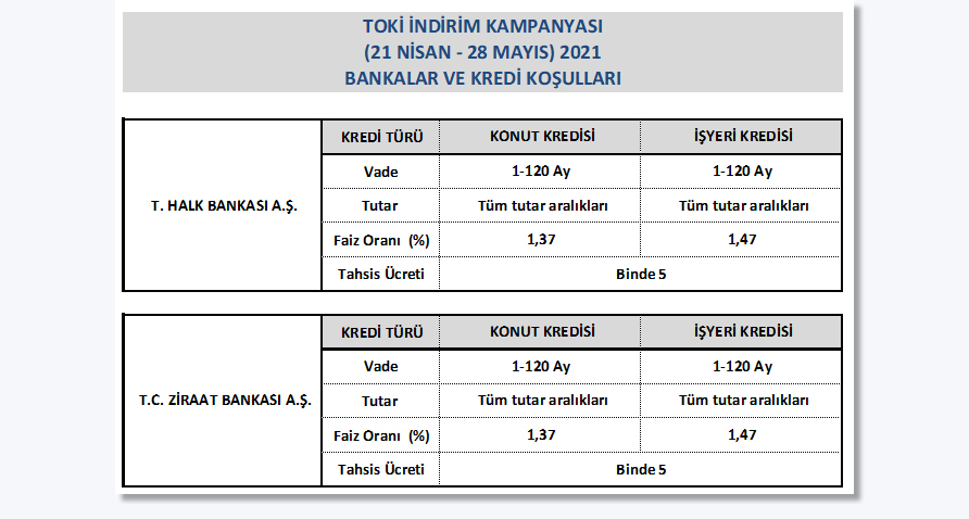 Kampanyadan yararlanmak isteyen konut ve iş yeri alıcıları 21 Nisan – 28 Mayıs 2021 tarihleri arasında ilgili bankaya başvuruda bulunabilecek.